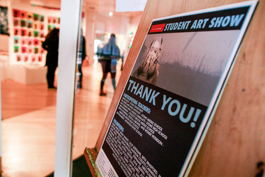 The Student Art Show is a waterfall, a cascade of work that sometimes overwhelms with a uniformity of production in the younger grades (it is obvious where exercises were completed by an entire classroom). One has to work a little harder to discover nuance and something expressive in an specific piece, and it is worth the effort: the show is exuberant and generous, and the towering effect of color-clad walls is palpable. One of the most unusual and playful collections was inspired by the visit of EMMA, the traveling studio on wheels that provides instruction in "making." For this show students elected to install work on scratch board that was complemented by electrical circuitry and LED lighting.